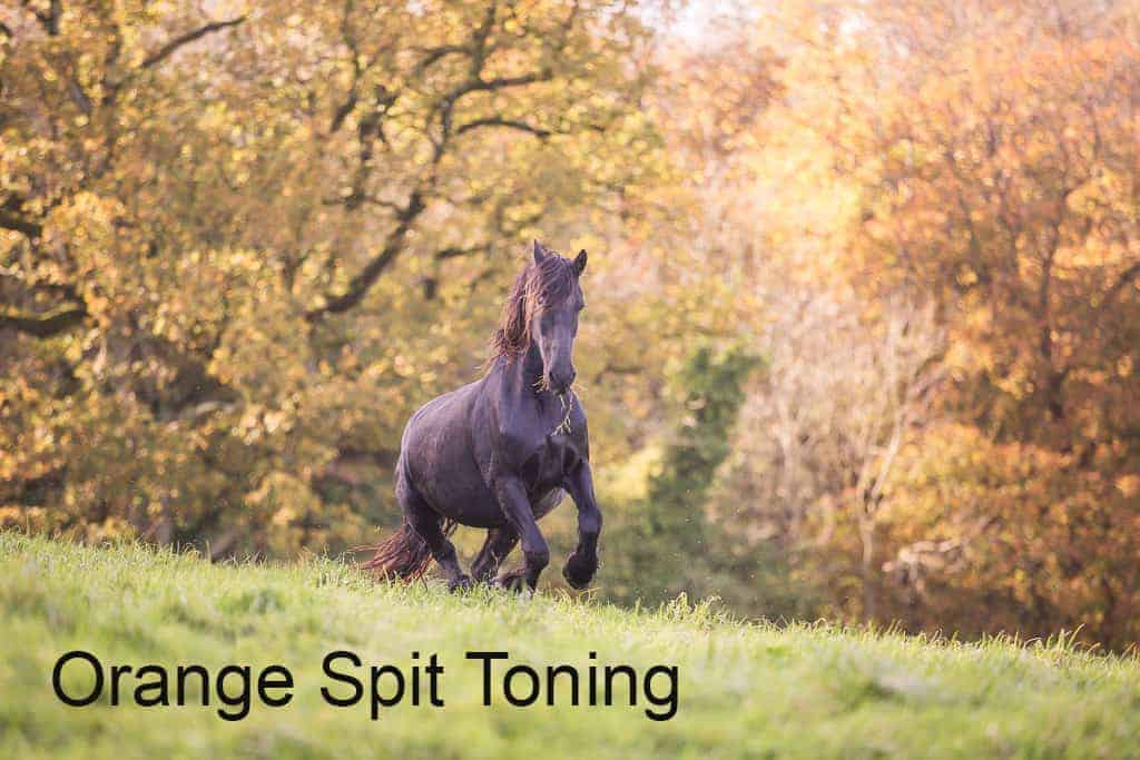 Next up using the adjustment brush tool I have painted an orange layer over the trees. The image looks a bit more natural than the previous edits above as the horse and grass are their natural colours now, but the tones of the trees are quite unnatural. Also because the change is quite significant because in Lightroom it is hard to edit defined edges there is a ‘halo’ around the horse created where the colour tapers, and also I often see bits being missed. In this image I have purposefully left the bits between the horse’s legs to illustrate. You can also see a section of the grass to the right of the horse where the adjustment brush has overlapped resulting in orangey/yellow grass.