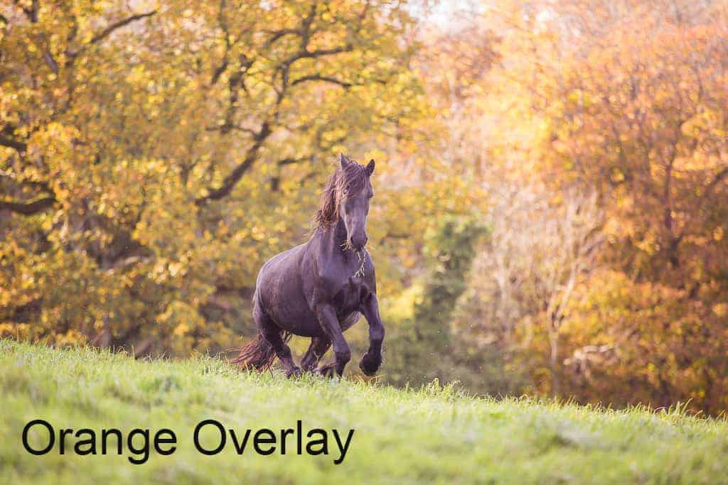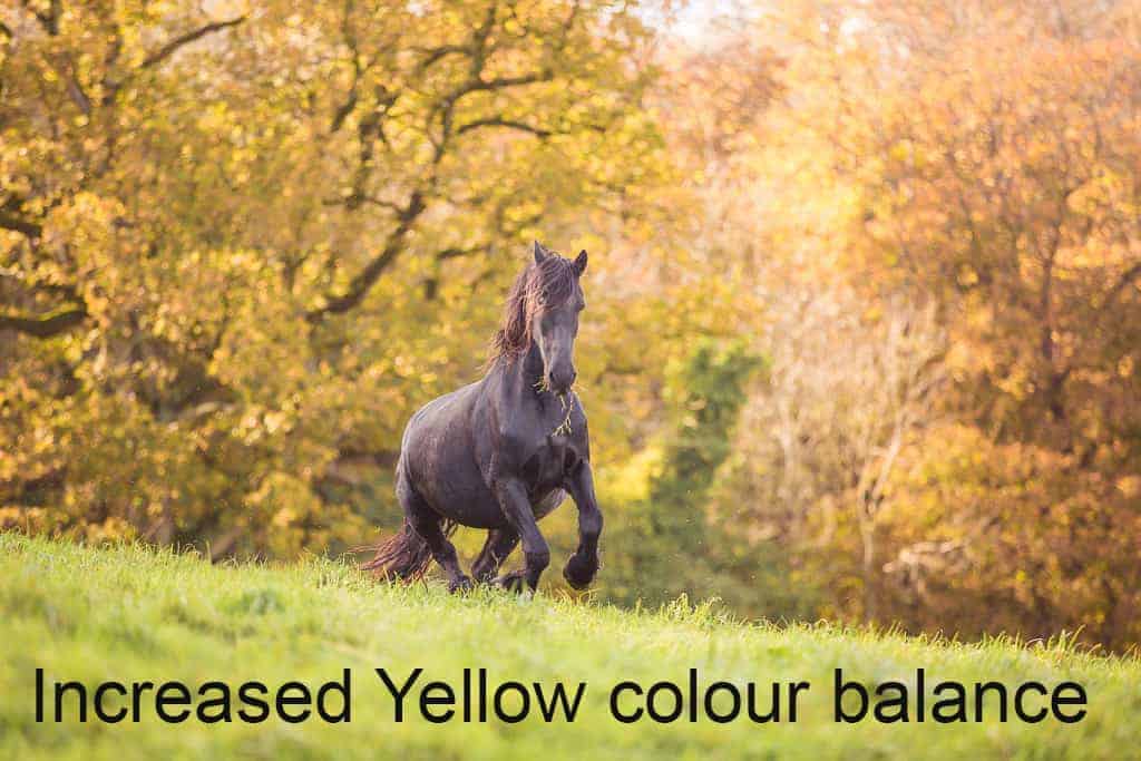 There are three simple changes that create similar results and are applied to the whole images. The first is ‘split toning’ the image. Here I have applied an orange hue to the highlights then a milder orange to the shadows. The second is adding an orange overlay to the entire image using the adjustment brush tool. Both these first two methods you can play with the selected colours to try and get the best possible result. The last edit is simply altering the colour balance of the image. By increasing the yellow component the image takes on a much more distinctive orange hue. The problem with all three of these edits though is that they look fake to varying degrees. The horse and the grass are now orange which is not realistic. This is the type of change I see quite regularly. On it’s own it can easily be missed just how orange the image has become.